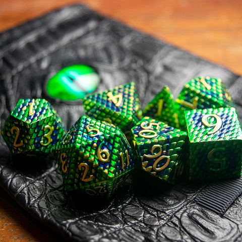 Each set includes seven metal polyhedral dice, inside a dragon leather bag with a green dragon eye.
