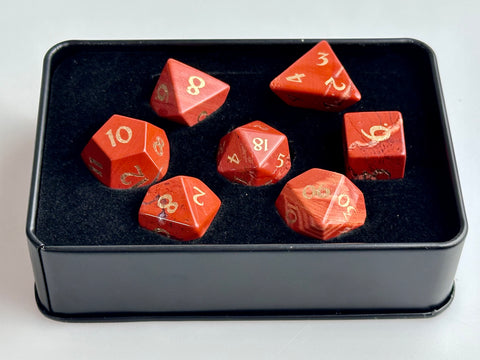 A complete set of 7 full-sized polyhedral dice, carefully hand-made from red jasper.  Each die is individually cut, then polished, and engraved with shiny gold numbers.